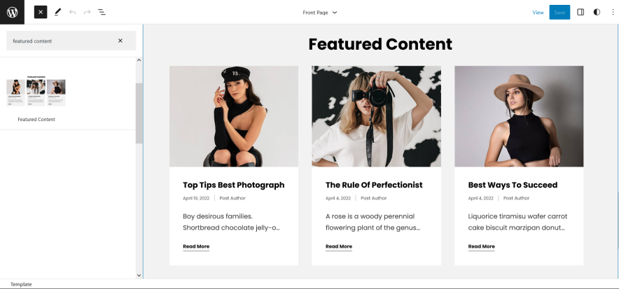 1. Click on the Block and pattern inserter (+) icon in the top toolbar and Click on Patterns. Browse the Patterns and select the one that you like to add.