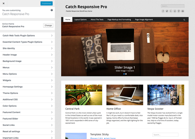 The most powerful feature of Catch Themes is its Theme Options which will allow you to easily customize your website with clicks. So, now you no longer need to be a designer or a programmer to build customized websites. Theme Options allow you to toggle on and off features, adjust layouts, change colors, fonts, logo, favicon, background, add social links and custom CSS.
