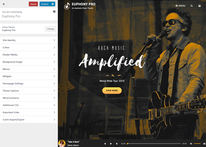 Euphony Pro is a premium music WordPress theme crafted beautifully for musicians and bands. It comes with a minimalistic, interactive and super elegant concept. Euphony Pro has been made to be versatile within the music industry and fun to play with. This theme is power packed with features like App Section, Contact, Events, Featured Video, Gallery, Hero Content, Logo Slider, Playlist, Portfolio, Sections Sorter, Services, Stats, Sticky Playlist, Team, Testimonials, and more. All of these features in Euphony Pro allows you to tweak your music website the way you like. Euphony Pro comes with numerous predefined demo. You can use those demos for different musical genres, as well as a number of varying projects that differ from magazine and music label to producer and blog. The theme is completely responsive and thus compatible with all kinds of modern browsers. Let that musical vibe flow from your website with Euphony Pro! For more information, check out Theme Instructions.