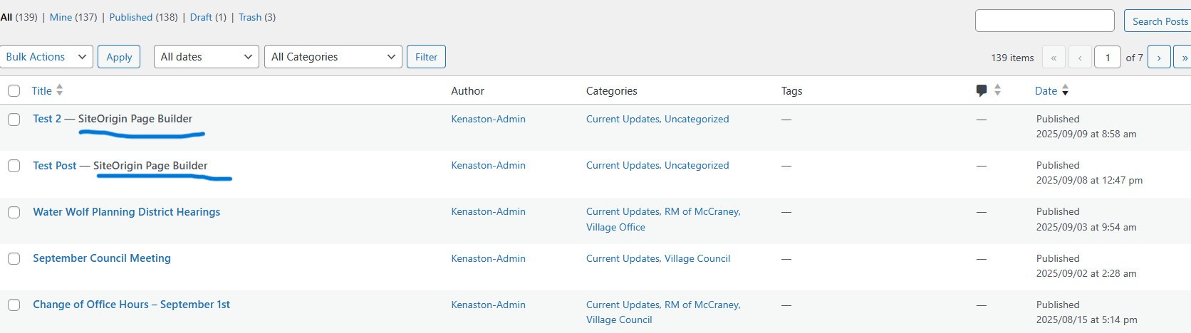 You can see below the same issue exists as soon as I turn PageBuilder to default. Interestingly though, if I delete the test post in question, yet even though page-builder default is STILL on, the next post in line (the one below it) does not create the issue. It’s only the newest post that creates the problem.