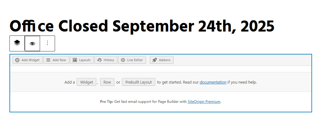 Below shown…..The post as done with PageBuilder default turned off. I then delete the poster (all content in other words), to to trigger the page builder ‘widget’.