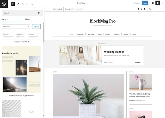 BlockMag Pro is a premium magazine WordPress block theme for full site editing. This theme is fully responsive, intuitive, and visually appealing. It is a beautifully designed theme perfect for building magazines and news websites. This block-based theme comes with an array of powerful customization options. The theme includes an eye-catchy light color scheme that looks more appealing. With the help of an intuitive drag-and-drop interface, you can easily customize your site. The theme includes simple and easy-to-use block patterns. There are 50+ block patterns, 22 Templates, and 11 Template Parts available in this theme to help you build the magazine site the way you want. Some of the block patterns are 404 Header, About Us With Stats, Archive Header, Blog Header, Featured News, Cover News, Style News, Lifestyle News, Most Popular News, Full-width Advertisement, Featured Content, Category wise News, Featured Video, Newsletter, Logo Slider, and many more. All the block patterns, Templates, and Templates Parts are fully responsive adapt to all screen sizes, are highly customizable, and have fast loading. Buy BlockMag Pro today and start building an amazing magazine website!