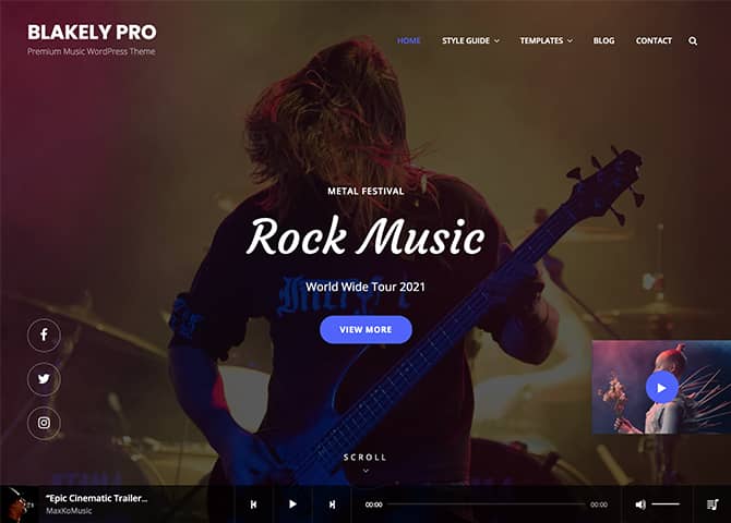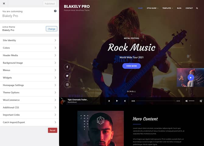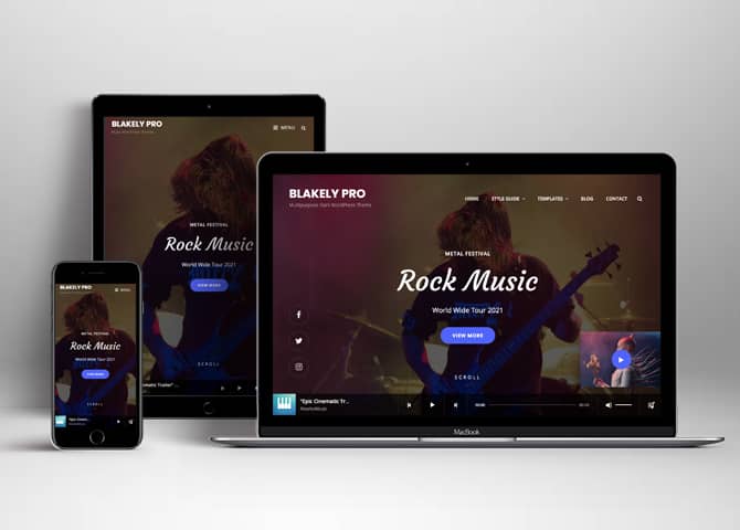 Blakely Pro is a Premium Dark Music WordPress theme that is ideal for building music websites. The theme is suitable for Solo Musicians, Bands, Artists, and Projects related to the music industry. Blakely Pro comes with a dark color scheme which is quite trending among music sites nowadays. The dark design makes your music site bold, beautiful, and classy. The theme is extremely easy to use and also fully responsive. Your music website will look amazingly perfect across all devices and screen sizes. This dark multipurpose music WordPress theme, Blakely Pro carries an abundance of crucial features and functionalities. For instance, Dark Music Design, Album, App Section, Contact, Countdown, Featured Video, Featured Slider, Featured Content, Gallery, Hero Content, Logo Slider, Menu Options, Playlist, Pop Up Video, Portfolio, Promotion Headline, Stats, Sticky Playlist, WooCommerce Products Showcase, Sections Sorter, Testimonials, Team, WPML Ready, and many more. All of these highly-customizable features and sections are completely responsive and absolutely easy to customize. Build a bold, beautiful, and chic music website in just a few minutes with Blakely Pro!