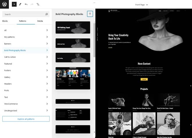 - Select “Bold Photography Blocks” to see list of pattern provided by Bold Photography Blocks