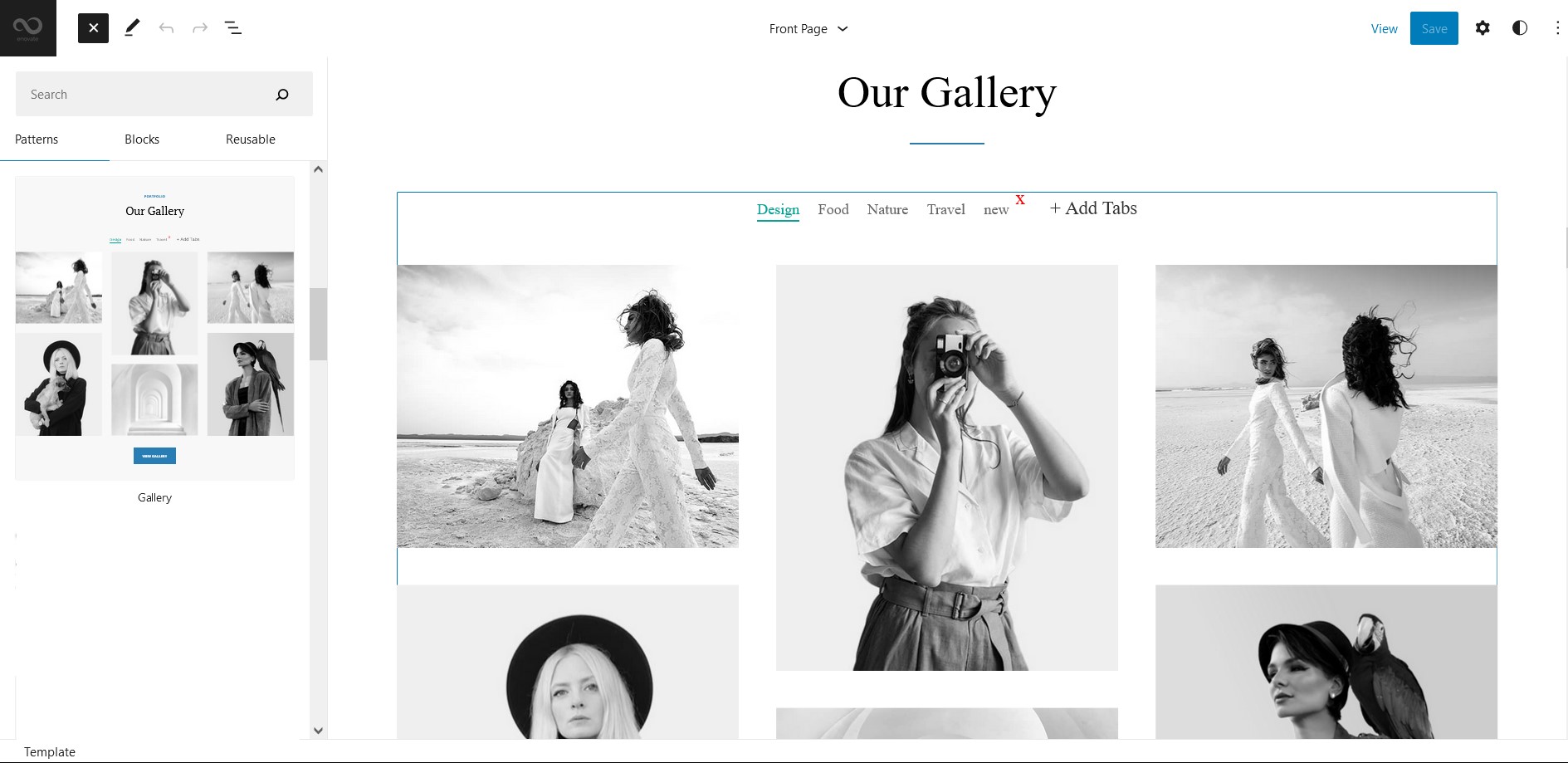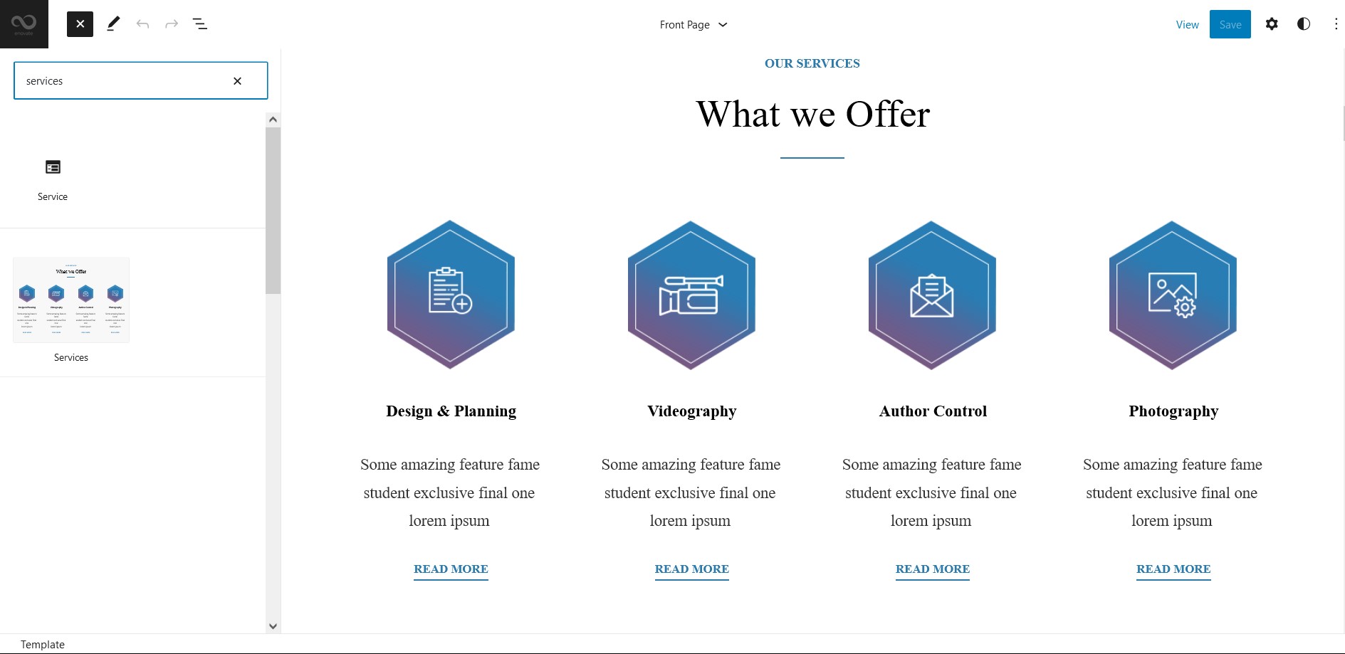 Comes with a collection of predefined block design layouts, available from the patterns tab of the block inserter. Create an elegant layout that combines different blocks. Build Gracefully!