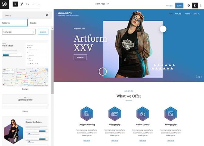VisionArt Pro is a premium photography WordPress block theme for full site editing. This theme is perfect for photographers, graphic designers, creative artists, photo bloggers, freelancers, and other creative photography-centric websites. It is a block-based theme that offers a range of features and design options for building a perfect photography website. The theme comes with a light color scheme with an amazing design. With Full Site Editing features, you can customize your site the way want. All the block patterns are simple and easy to use so drag and drop the blocks and build the content perfectly. There are 32 + different block patterns, 26 FSE Templates, and 15 Template Parts available in this theme. Some block patterns are Contact, Events, Header Media, Pricing, Sidebar, Subscribe, Video Section, Testimonial, Archive Header, Footer With Four Columns, Header Transparent, Header With Search Cart, Product Sidebar, Featured content, and many more. All of the blocks, block patterns, templates, and template parts in VisionArt Pro are highly customizable, fully responsive, fast loading, and adapt to all screen sizes perfectly. Buy VisionArt Pro today and build a stunning photography website and let your photos shine.