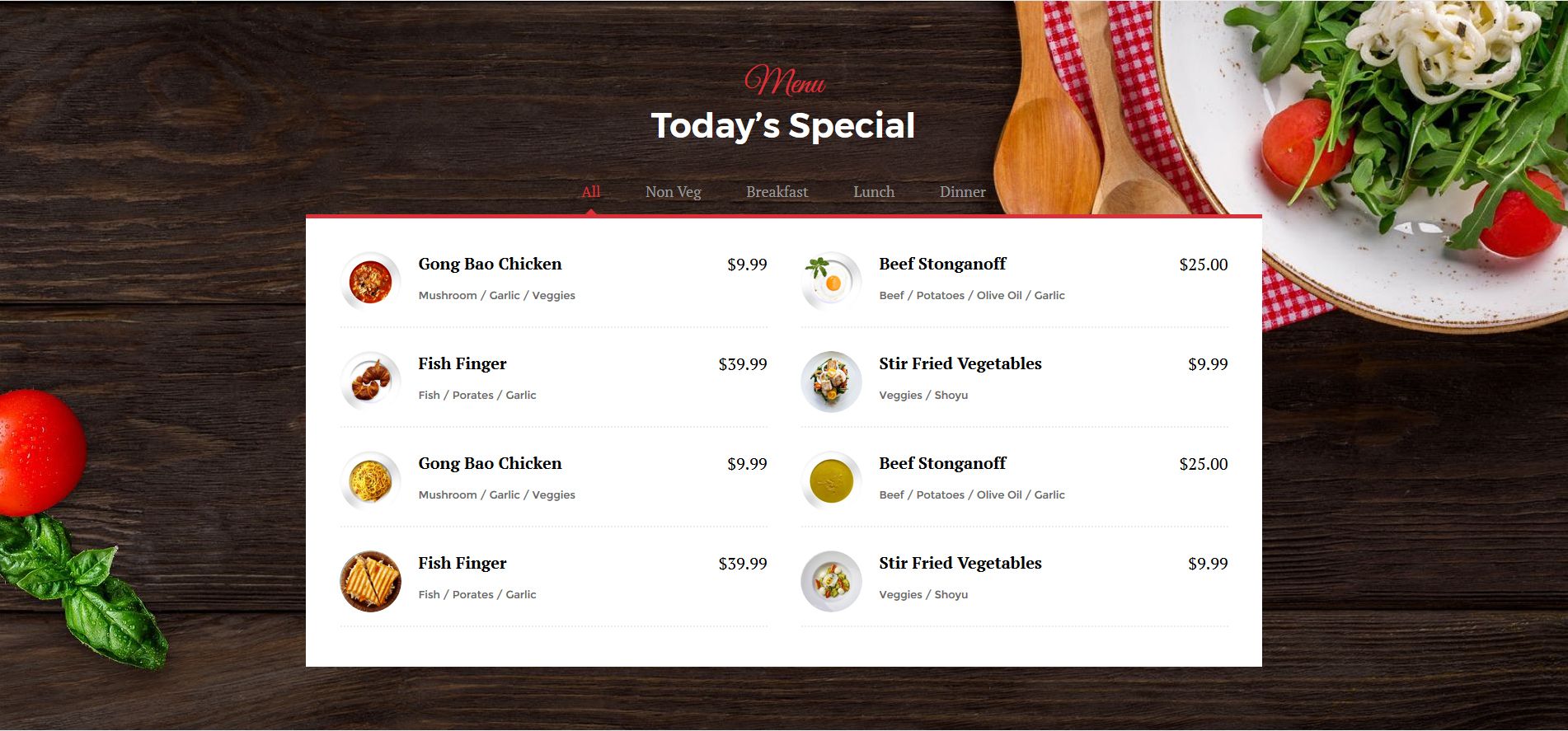 With the Food Menu, add a unique and delicious-looking food menu on your website elegantly.