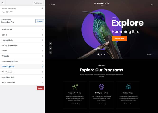 The most powerful feature of Catch Themes is its Theme Options which will allow you to easily customize your website with clicks. So, now you no longer need to be a designer or a programmer to build customized websites. Theme Options allow you to toggle on and off features, adjust layouts, change colors, fonts, logo, favicon, background, add social links and custom CSS.