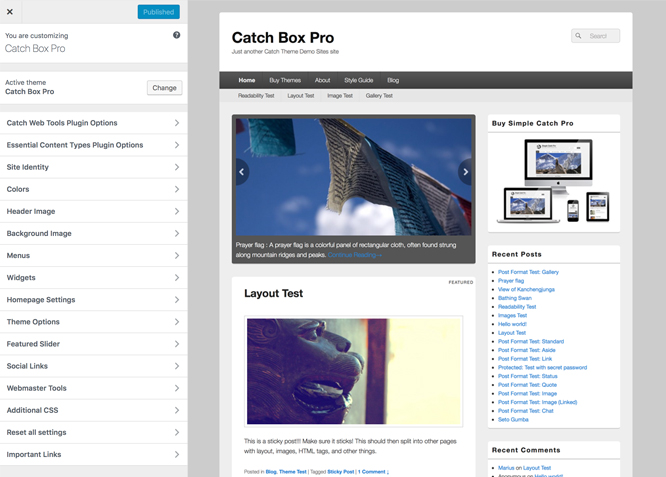 The most powerful feature of Catch Themes is its Theme Options which will allow you to easily customize your website with clicks. So, now you no longer need to be a designer or a programmer to build customized websites. Theme Options allow you to toggle on and off features, adjust layouts, change colors, fonts, logo, favicon, background, add social links and custom CSS.