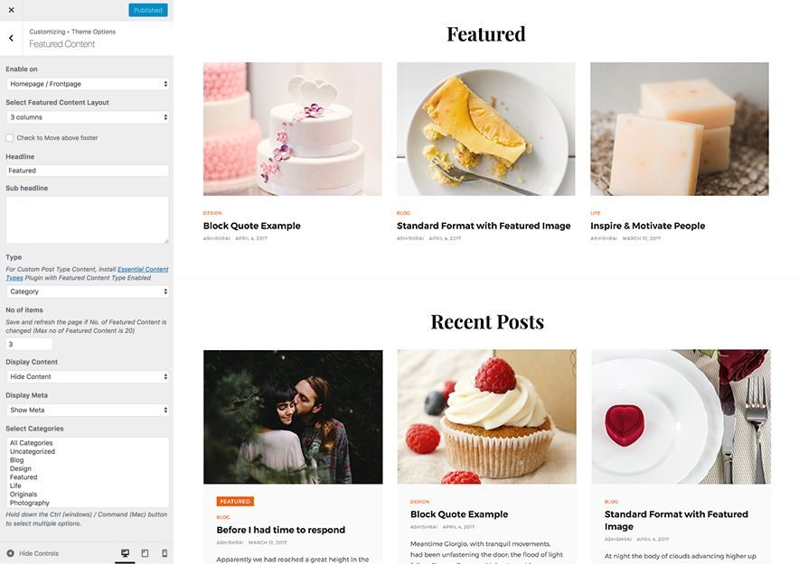 - Featured Content: Option to select Post, Page, Category, Image, Custom Post Type (requires Essential Content Type Plugin ) as Featured Content further option to enable/disable content on Entire site and Homepage/Frontpage, select featured content layout, edit Headline and Subheadline for Featured Content, select no. of featured content, Display Content, Display Meta, select multiple categories
