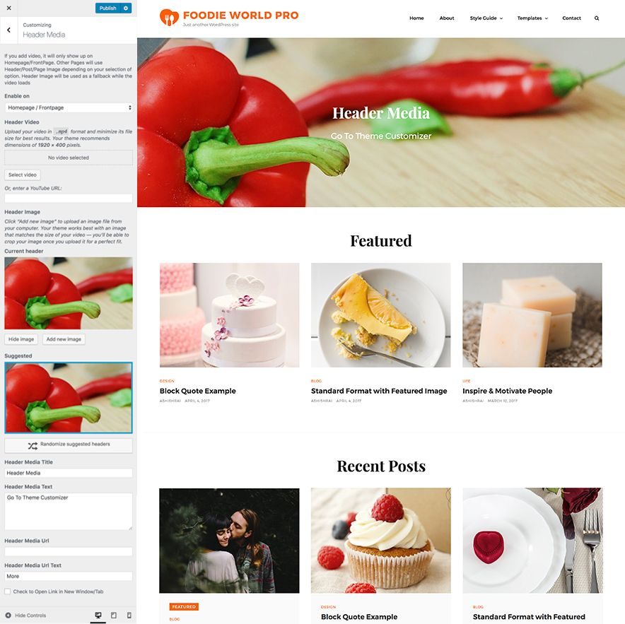 - Header Media: Option to add Custom Header video or embed video from YouTube, display/hide Header Image, add Header Media Title, Header Media Text, Header Media URL Text, open link in new window/tab