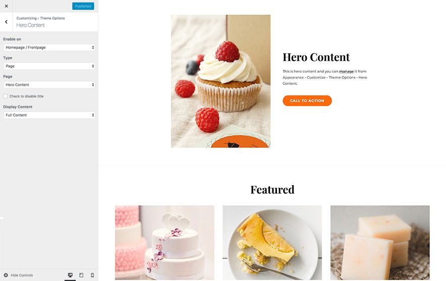- Hero Content Options: Option to enable/disable Hero Content in Homepage/Frontpage and entire site. Select content type as Page.