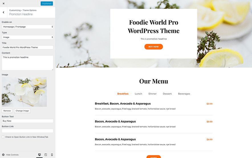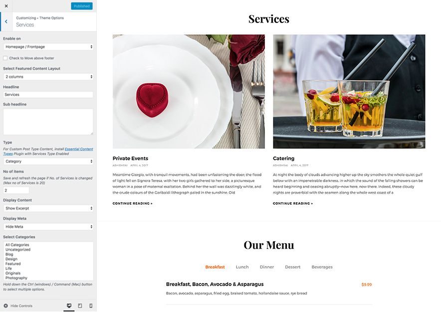 - Food Menus: Enable/disable Food Menu in entire site or homepage/frontpage. Option to use Custom Post type(requiresEssential Content Type Plugin) Food Menus, edit headline and subheadline, number of items, edit button text and button link