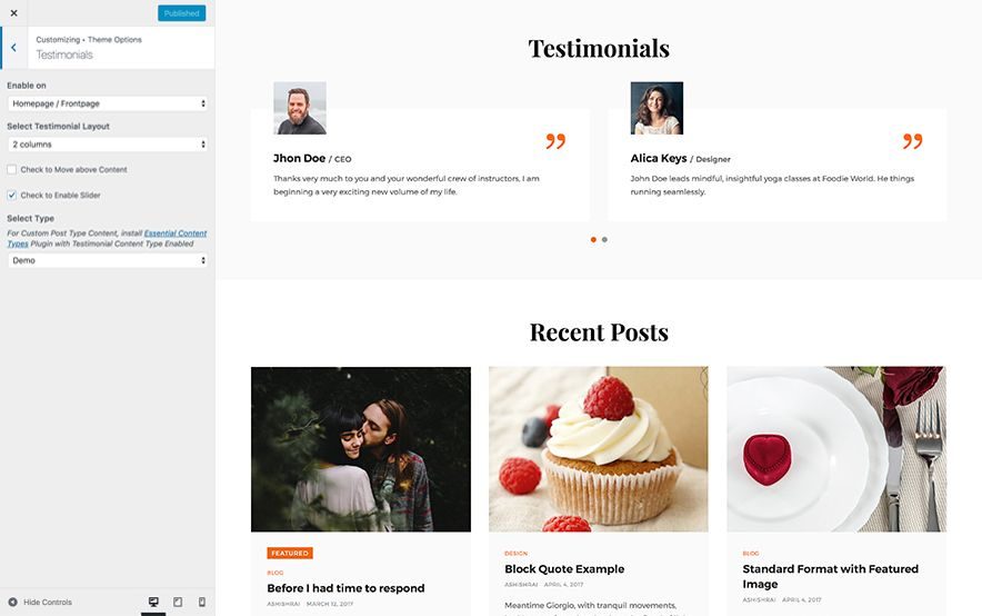 - Testimonials : Option to enable/disable Testimonials in Homepage/Frontpage and entire site. Option to select Custom Post Type (requires Essential Content Type Plugin ) as testimonials