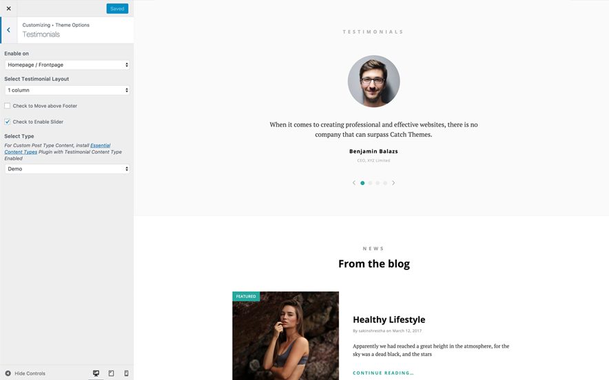 - Testimonials :Option to enable/disable Testimonials in Homepage/Frontpage and entire site. Select content type as Post, Page, Category, Image and Custom Post Type (requires Essential Content Type Plugin ). Option to select layout for testimonials