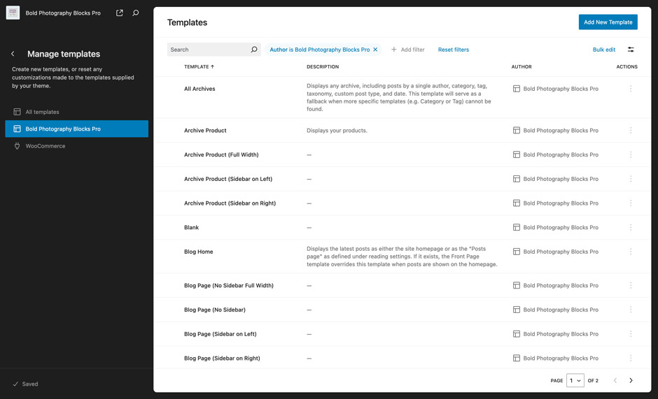 You can find 31 Templates provided by Bold Photography Blocks Pro. You can customize these templates if you feel like changing anything on a certain template and wish to see those changes across your site.