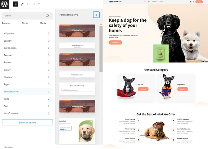 Dashboard >> Editor >> ‘+’ Toolbar (Top Left) >> Patterns >> Select PawsCentral Pro from the dropdown menu >> Add/Insert PawsCentral Pro Patterns accordingly